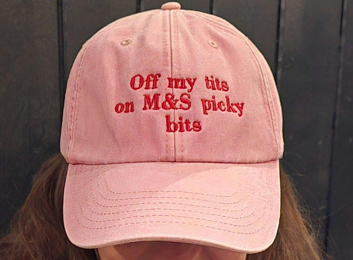 Cite unisex embroidered cap with ’off my tits on M&S picky bits’ slogan